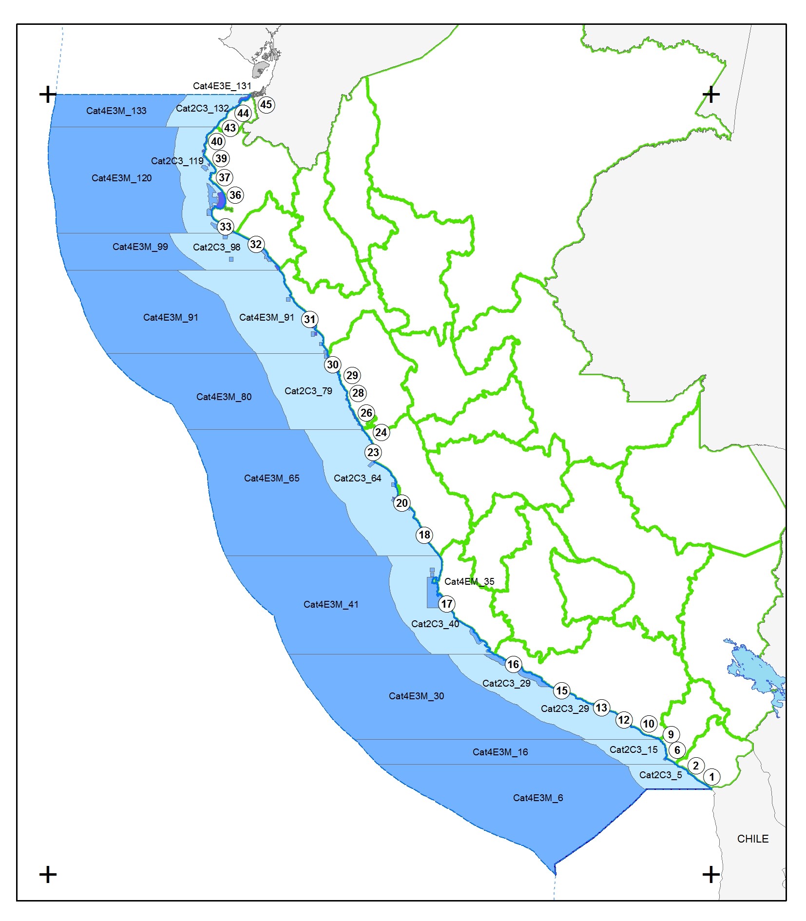 Description: Para la delimitación de las unidades de clasificación del cuerpo de agua marino - costero se establecieron criterios técnicos basados principalmente en la identificación de las características naturales, como la delimitación de bancos naturales de especies, sustratos rocosos y de invertebrados, muchas de ellas consideradas como áreas naturales protegidas por el Estado; y así como los usos que se destina el medio marino, como la pesca industrial, artesanal, actividades hidrocarburíferas, ubicación de áreas de desarrollo portuario, entre otras actividades.